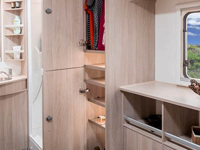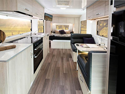 There are several layouts available to cater for those who like to travel on their own, as a couple or with the family. You can choose between a queen width bed, single beds and bunk beds plus a choice of a dinette or a lounge